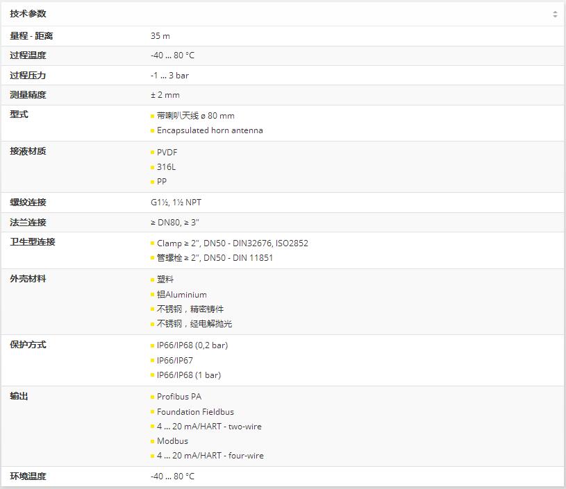 雷達物位計VEGAPULS 61在連續非接觸測量容器內液位的應用中,雷達傳感器VEGAPULS 61被廣泛應用。雷達傳感器的應用遍及幾乎各個工業領域。特別是在污水處理廠、污水處理裝置、環境及能源行業的設備上使用這種經濟劃算的雷達傳感器,用于連續物位測量。